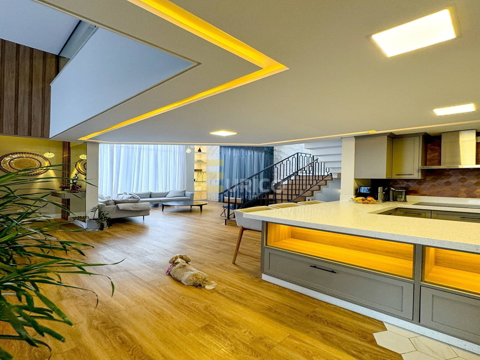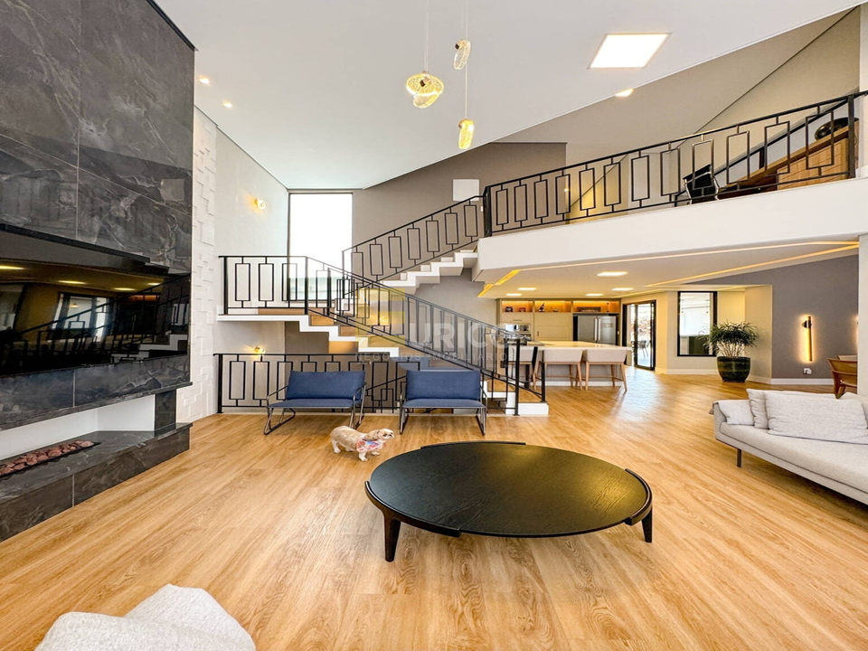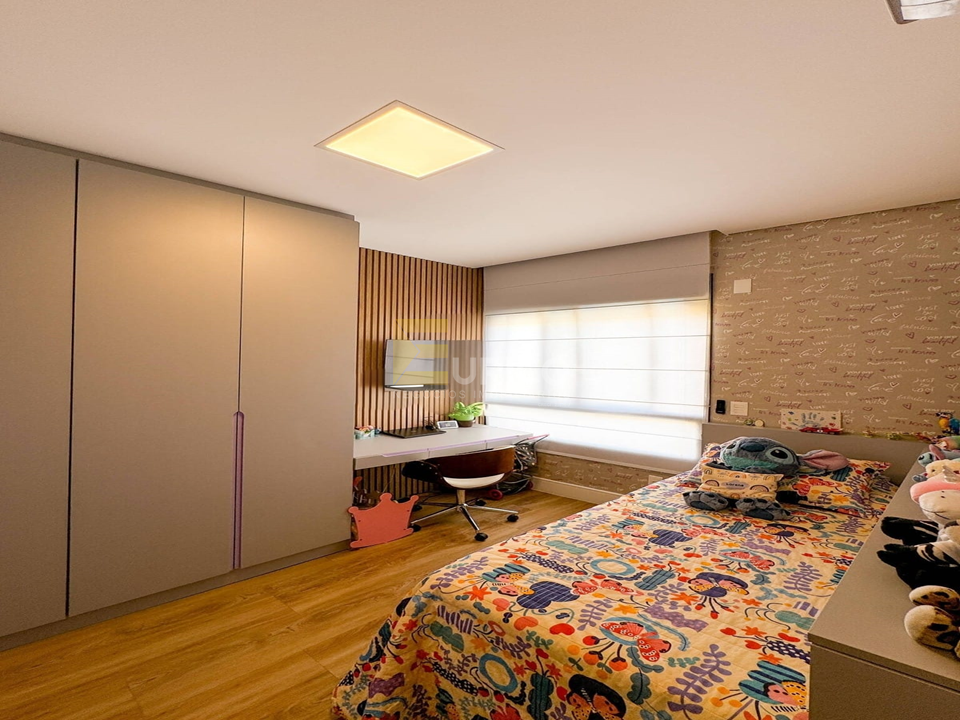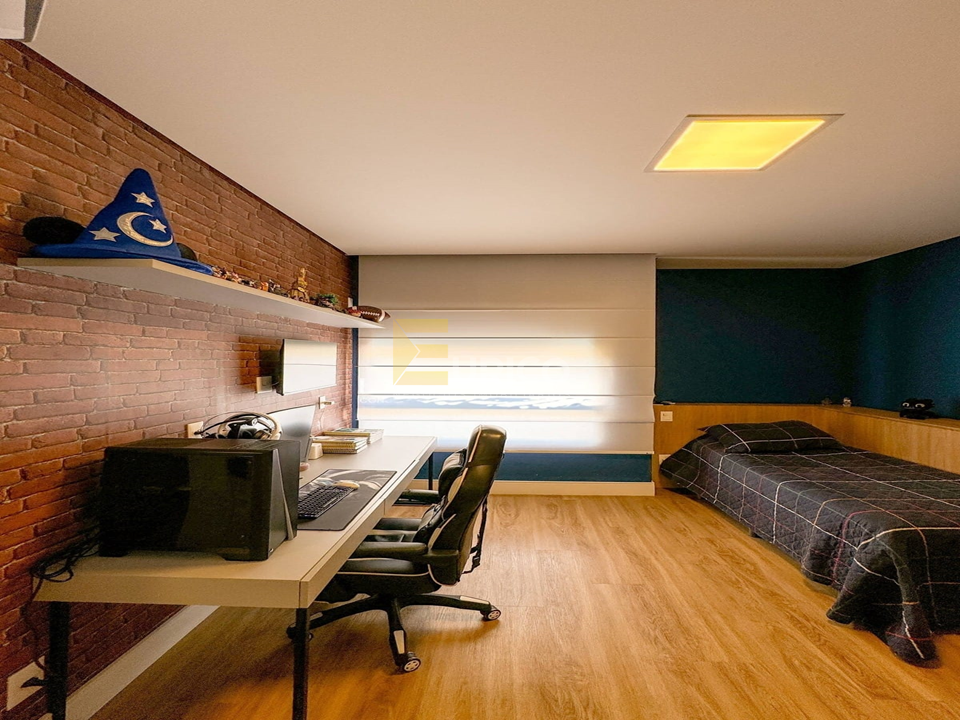 Escritório adaptado ao logo do corredor que dá acesso aos quartos, Ar condicionado em todos os cômodos, repleta de móveis planejados com fino acabamento, lareira e varanda na sala.