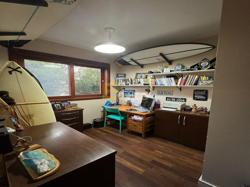 - Home office, sala ampla com pé direito duplo na sala de jantar, lareira na sala de estar.