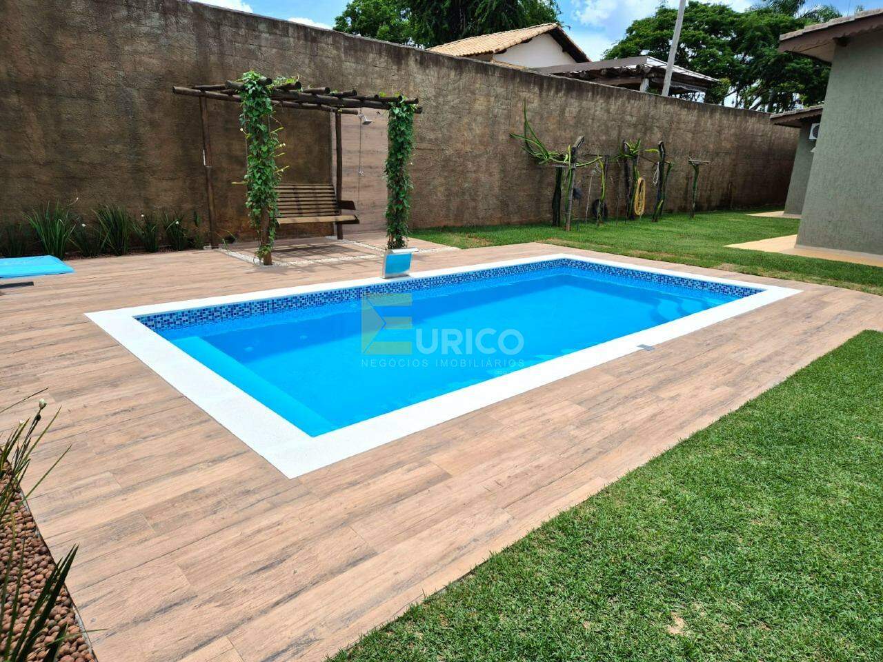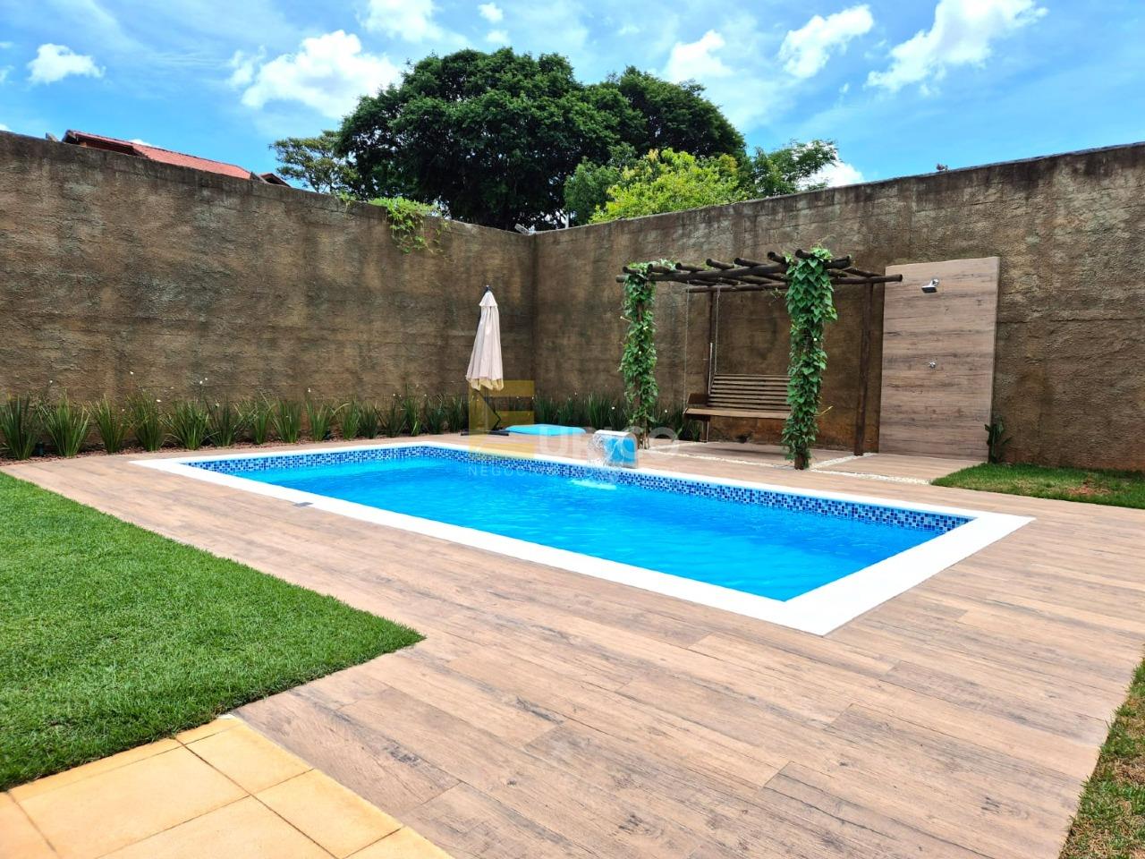 Área gourmet com piscina (recém construída), churrasqueira, forno de pizza, banheiro e pomar produzindo.